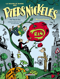 Pionniers de la bd (ils ont été créés en 1908 par Louis Forton, tout comme Bibi Fricotin) les Pieds Nickelés restent parmi les personnages de papier les plus célèbres. Les aventures de ces 3 filous (Ribouldingue, Filochard et Croquignol) partisans du moindre effort ont enchanté des générations entières de français, avant de s'interrompre brutalement. On croyait donc nos 3 lascars définitivement rangés des voitures et voilà qu'une bonne crise économique comme on en faisait plus les fait ressurgir de l'oubli, sous la plume de Stéphane Oiry et le trait de Trap. 10 mois après Pas Si Mal Logés, la nouvelle bande des Pieds Nickelés a décidé de s'interresser à l'écologie et aux problèmes de santé publique avec Bio-Profiteurs. On y découvre un Paris terrorisé par une nouvelle pandémie : la grippe du pigeon, qui a pour conséquence de faire détaler les foules au moindre éternuement. Celui-ci pourrait d'ailleurs vous coûter cher car le SLIP ou Service de Lutte contre l'Invasion Pandémique ne rigole pas avec les propagateurs de postillons, contaminés ou non. Ribouldingue, qui vient de développer une allergie à l'alcool, découvre les vertus du bio en savourant un délicieux yahourt. Toute la bande s'y met et ne jure plus que par l'alimentation de qualité, débutant par la collecte des légumes défraichis à la fin du marché (qu'ils refourgent en purée bio dans les couloirs du métro) et finissant comme employés, non-volontaires, d'une cantine kossovare (!) qui tire sa matière première d'un potager installé dans une zone constructible. Les personnages secondaires et l'argot des Pieds Nickelés se sont modernisés. Au contraire très classique, le graphisme colle bien à la peau de notre trio. On peut toutefois regretter une histoire un peu trop tirée par les cheveux.