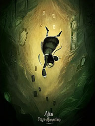 Pour cette nouvelle version de la célèbre histoire imaginée par Lewis Caroll, le dessinateur Xavier Collette (Seigneur Puma, éditions Mic-Mac) a choisi de livrer une vision bien personnelle de cet univers fantasmagorique. Servi par un scénario signé David Chauvel, grand habitué des adaptations de classiques en bande dessinée (Le Magicien D'Oz, L'Île Au Trésor - Delcourt), le dessin reprend tous les éléments phares de l'intrigue. À ceci près qu'il s'agit d'une vision encore plus sombre, où les personnages principaux se déclinent en gammes de noir et blanc, où les couleurs disparaissent à mesure que l'album avance. La finesse du trait de Xavier Collette fait écho aux auteurs en vogue du moment, tels que Benjamin Lacombe (La Mélodie Des Tuyaux, 2009) ou Jérémie Almanza (Eco, 2009). Une nouvelle déclinaison prometteuse, qui nous permettra de nous immerger davantage dans le terrier du lapin blanc, puisqu'elle sortira deux semaines avant le film de Tim Burton, Alice In Wonderland.