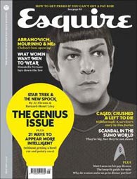 Au cas où vous ne prendriez pas ce personnage aux oreilles pointues et à la coupe en bol au sérieux, sachez que Spock, puisqu'il s'agit bien de lui, est un mythe américain depuis les années 1960. Incarné de façon mémorable à la télévision puis sur grand écran par l'étrange Leonard Nimoy, il n'est pas sans rappeler, pour les spécialistes de comics américain, un certain Namor Prince des mers, créé en 1939. Il lui emprunte ses oreilles et son métissage. certes, Namor était mi-terrien, mi-atlante et Spock, créé par Gene Roddenberry, vient lui pour moitié de la planète Vulcain, mais les similitudes sont troublantes. Notre cher Bernard-Henry Levy (qui sait toujours tout sur tout) avait sans aucun doute fait le raprochement. Il se penche en tout cas -et c'est très sérieux- sur "le sens de Star trek", dans un article étonnant que le magazine Esquire consacre à ce phénomène, qui revient sur le devant de la scène grâce à un formidable film, de J.J. Abrams (le 6 mai sur vos écrans).