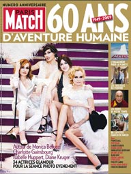 "60 ans d'aventure humaine", nous annonce la première de couverture de ce numéro spécial d'un magazine phare qui a tout même perdu de sa superbe depuis bien longtemps, depuis l'époque du "poids des mots" et du "choc des photos". Le slogan a changé aujourd'hui (ndlr: 'la vie est une histoire vraie') et la qualité incroyable des reportages a fait place à un voyeurisme quasi systématique. Restent quelques beaux éclats tout de même, les fameux numéros dits "historiques" (Obama Président par exemple). Quant à la couverture de ce numéro anniversaire, qui réunit sur une même photo quatre actrices en vogue, on ne peut qu'être déçu car Match a fait beaucoup plus fort par le passé. La crise est-elle passée par là ? Retrouvez dans ce numéro une interview exclusive de Brigitte Bardot qui fit sa première couverture Match dès 1951 et un reportage étonnant ou le Dalaï Lama revient, avec les photos de Paris Match, sur 50 ans d'exil.