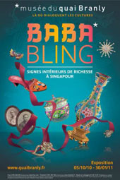 Pour cette rentrée 2010, le Quai Branly a mené l’enquête au cœur de la communauté chinoise de Singapour, qu’il nous présente dans une exposition de plus de 480 objets éclectiques et intrigants. Fidèle à sa politique culturelle, qui mène de front la volonté d'un esthétisme de qualité et l'exigence d'un contenu didactique propre à l’ethnographie, le musée parisien pousse toujours plus loin sa vocation de rendre saisissable le processus d’échange culturel. Cela se manifestera ici dans l’émergence du style "BABA", un nouveau genre, à la croisée des cultures chinoise, malaise et occidentale, semblant à même de mesurer efficacement les répercussions sociales et esthétiques opérée sur une période de 500 ans, date d’arrivée des ethnies chinoises dans la "ville du Lion" (Singapour). L'exposition est présentée à travers une scénographie audacieuse, qui singe l’agencement et le style des maisons BABA pour encore mieux nous plonger dans le vif du sujet.