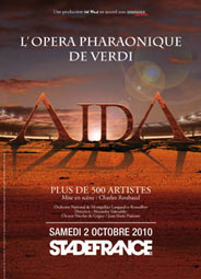 Que Saint-Denis se prépare : les enceintes du Stade de France vont accueillir à l'automne l'œuvre magistrale d'un compositeur romantique italien du XIXème siècle, le légendaire Verdi. Aïda est sans doute l'opéra le plus familier aux oreilles profanes. Son thème existentiel rappelle que l'Histoire est plus forte que les individus. Le triangle amoureux Aida-Radamès-Amneris en fait les frais. Aïda fut le cadeau de Verdi à l'Egypte à l'occasion de l'inauguration du canal de Suez. Mis en scène par Charles Roubaud, le chœur Nicolas de Grigny sera dirigé, dans cette version 2010, par Jean-Marie Puissant. Cinq-cent artistes (solistes, musiciens, danseurs et choristes) sont prêts à enflammer le Stade de France au même titre que d'autres opéras comme Carmen ou encore Ben-Hur, aux succès inoubliables.